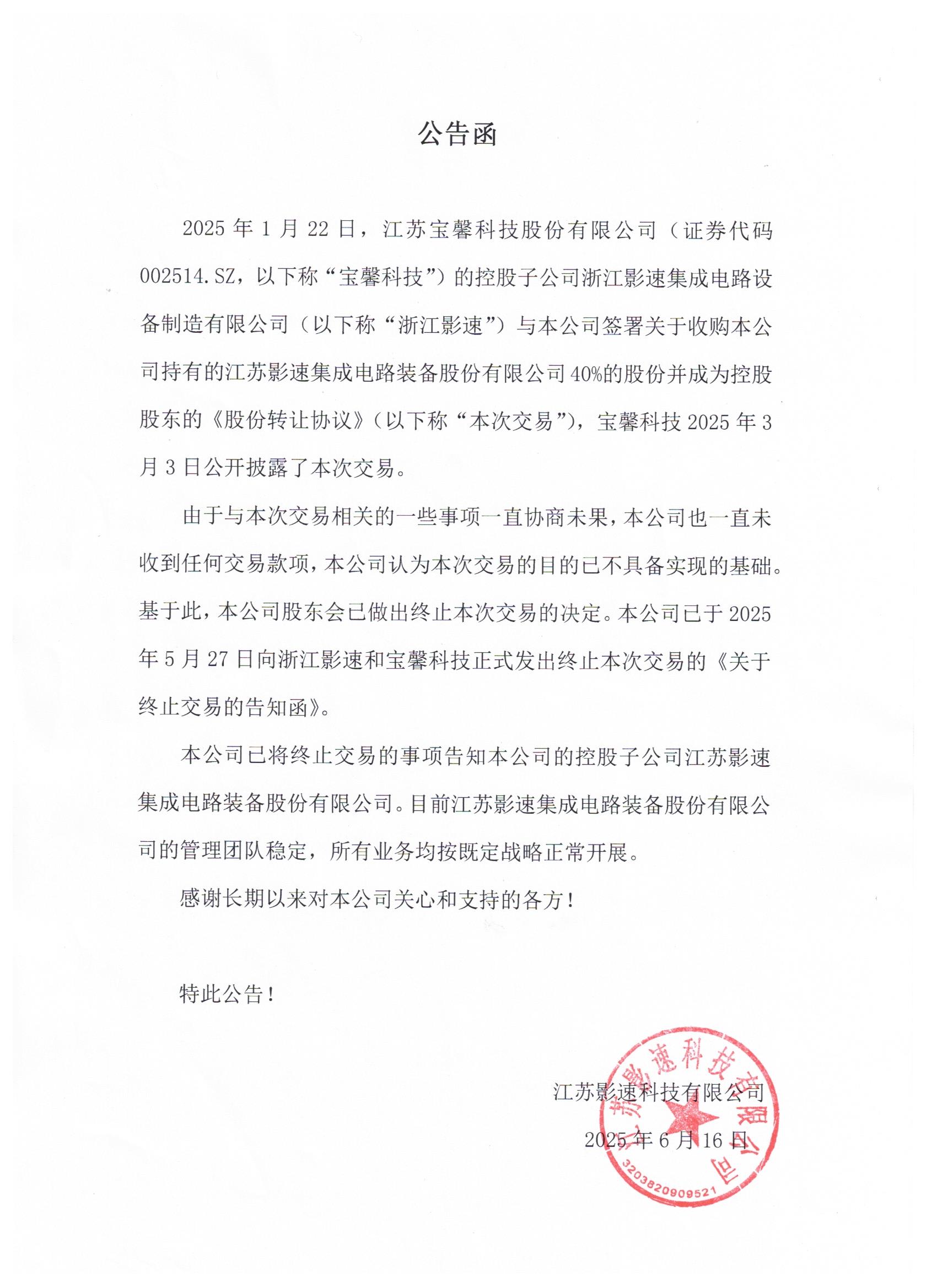 由于与本次交易相关的一些事项一直协商未果,江苏k1体育科技有限公司也一直未收到任何交易款项,江苏k1体育科技有限公司认为本次交易的目的已不具备实现的基础。基于此,江苏k1体育科技有限公司股东会已做出终止本次交易的决定。江苏k1体育科技有限公司已于2025年5月27日向浙江k1体育和宝馨科技正式发出终止本次交易的《关于终止交易的告知函》。